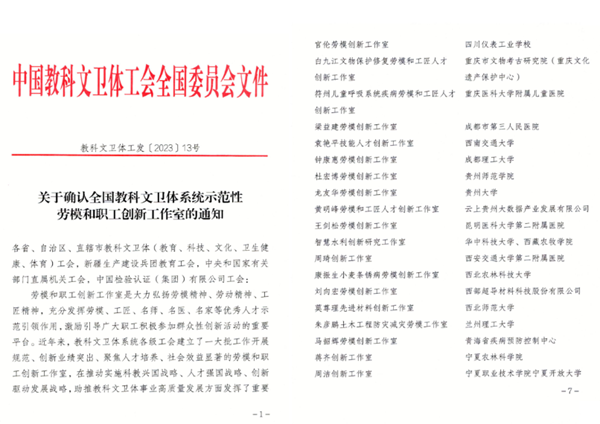 据了解,劳模和职工创新工作室是中国教科文卫体工会为大力弘扬劳模精神、劳动精神、工匠精神,充分发挥劳模、工匠、名师、名家等优秀人才示范引领作用,激励引导广大职工积极参加群众性创新活动而设的重要平台。本次全国有98个工作室(陕西省2个)被确认为全国教科文卫体系统示范性劳模和职工创新工作室。