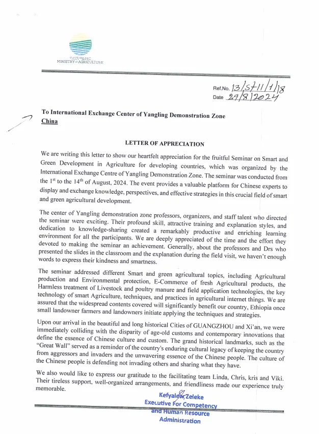 “那些在课堂上展示幻灯片、在实地考察中进行教学的教授和博士们,他们的友好与智慧是无法用言语充分表达的。我们期待在未来几年继续加强中埃两国在农业发展领域的合作,共同促进埃塞俄比亚的繁荣与发展。”来自埃塞俄比亚农业部能力与人力资源管理执行官Kefyalew Zeleke先生在感谢信中如是说。