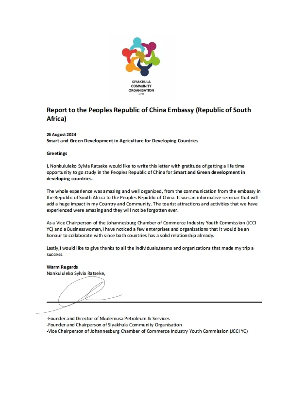 南非约翰内斯堡商会青年委员会副主席Nonkululeko Sylvia Ratseke表示:“这是一次极具信息量的研修班,将对我的国家和社区产生巨大的影响。中国和南非之间已经有了坚实的合作关系。作为约翰内斯堡商会青年委员会副主席及一名商界女性,在中方的组织下,我与几家企业和组织达成合作意向,这是我的荣幸。”