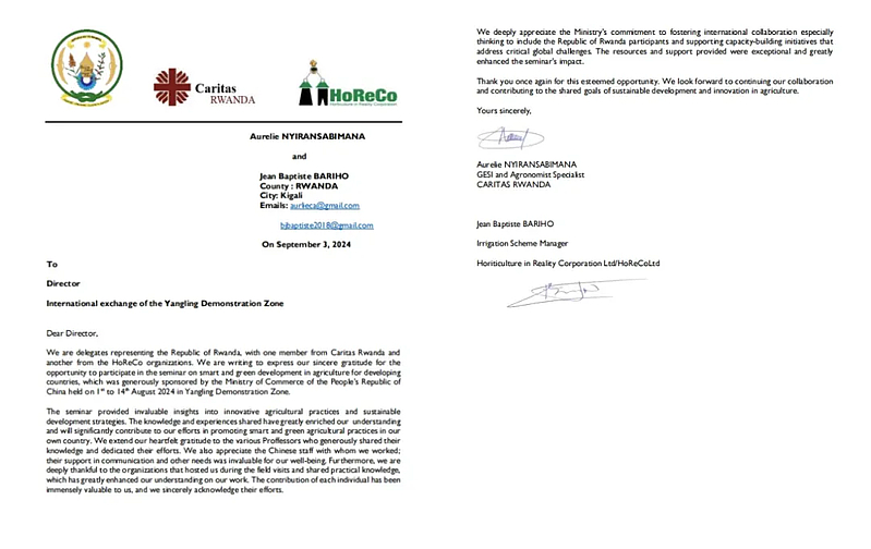 在2024年中非合作论坛峰会举办之际,杨凌示范区收到了一份特殊的“礼物”——来自埃塞俄比亚、尼日利亚、南非、坦桑尼亚和卢旺达非洲等国家学员的五封感谢信,感谢杨凌示范区作为主办方在发展中国家智慧农业与绿色农业发展研修班和发展中国家现代养殖管理研修班上所做的辛勤努力和付出。