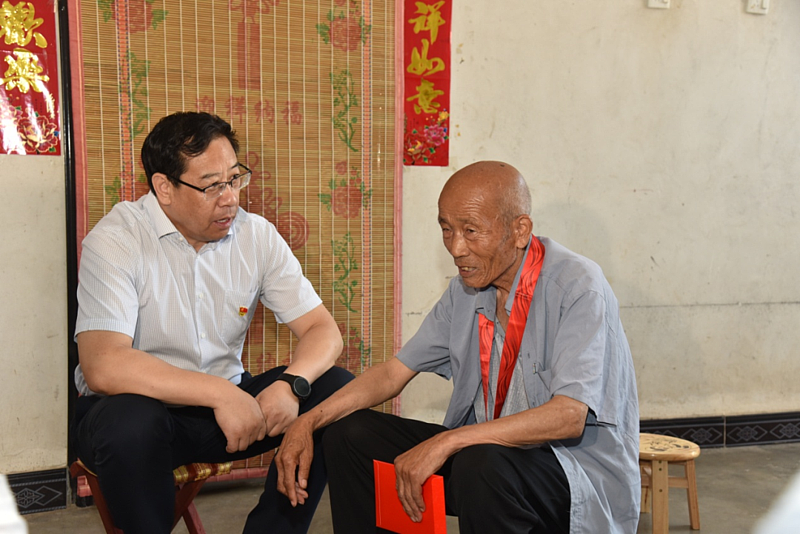 在大寨街道西卜村,史高领看望慰问了老党员彭展房。彭展房今年70岁,1976年5月入党,和老伴、母亲一起生活。