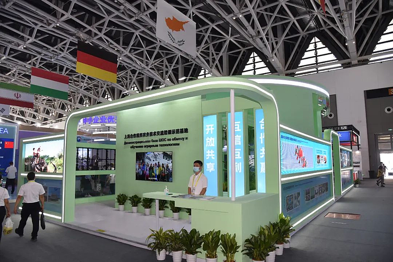 在位于国际馆的上合组织农业基地专题展位前,不少外国友人驻足观看,这里集中展示了上合组织农业基地农业科技交流、技术推广和经贸促进等方面的内容。