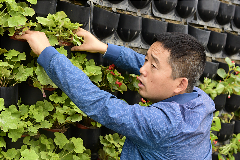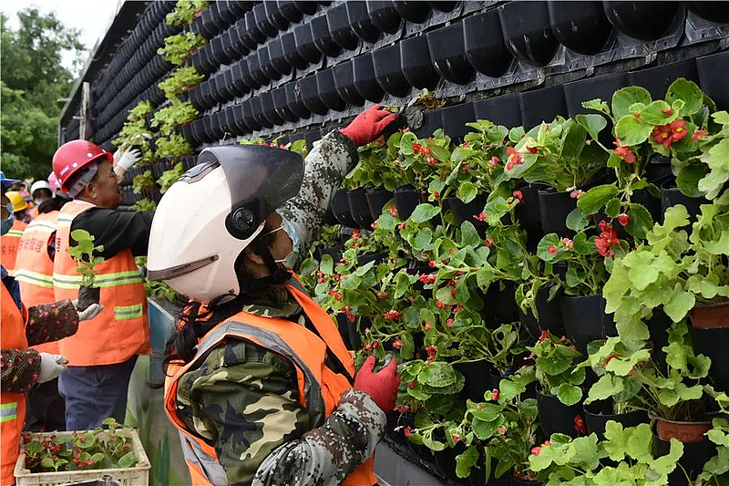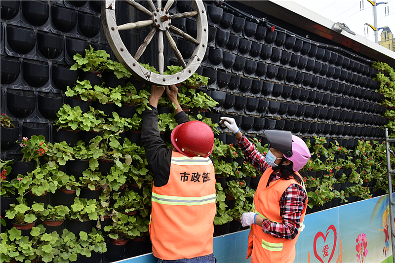 “这个花一定要插紧一点,这样才能展示出效果。”8月30日,连续阴雨的城市刚刚放晴,示范区市政公司绿化养护部副部长吴永刚就带领工人们来到邰城路立交桥,开始用花卉装扮这里的立体墙。