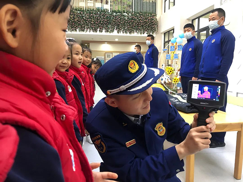 “小朋友们,大家看,我现在手上拿个这个就是热成像仪,这个就能在火场中探测到被困人员的具体位置。”