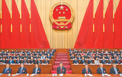 人民大会堂大礼堂气氛隆重热烈,主席台帷幕正中的国徽在鲜艳的红旗映衬下熠熠生辉。