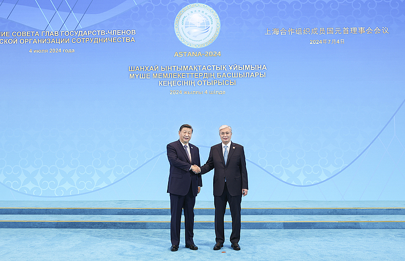 当地时间7月4日上午,国家主席习近平在阿斯塔纳独立宫出席上海合作组织成员国元首理事会第二十四次会议。这是习近平同上海合作组织轮值主席国哈萨克斯坦总统托卡耶夫握手。新华社记者 庞兴雷 摄