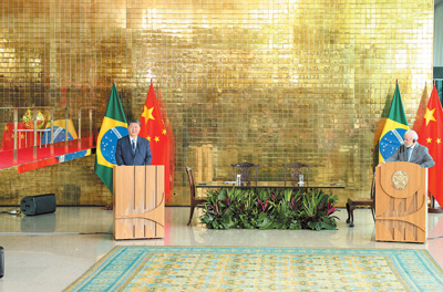 我们就中巴关系未来发展达成新的战略共识,其中最重要的是,我们共同决定将双边关系提升为携手构建更公正世界和更可持续星球的中巴命运共同体,同时将共建“一带一路”倡议同巴西发展战略对接。在世界格局加速演变的背景下,这体现了中巴两个发展中大国识变、应变、求变的决心,必将推动两国关系继往开来、开启下一个“黄金50年”,同时为全球南方国家团结自强树立榜样,为提升发展中国家在全球治理中的代表性和发言权作出新的贡献。