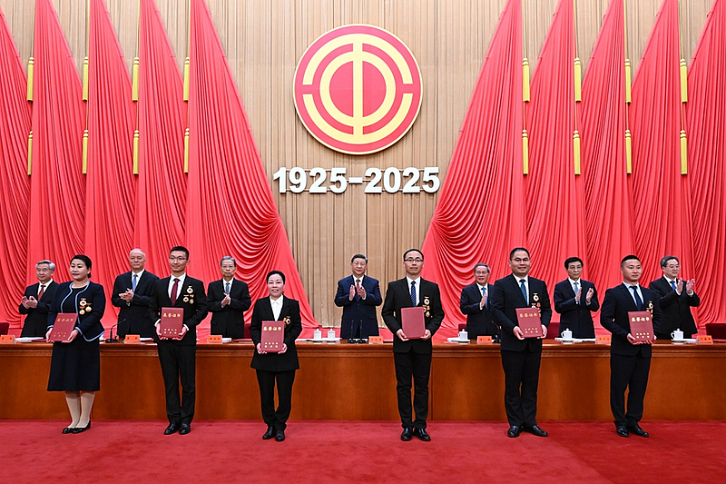 人民大会堂大礼堂气氛隆重热烈。主席台上方悬挂着“庆祝中华全国总工会成立100周年暨全国劳动模范和先进工作者表彰大会”会标,后幕正中悬挂中国工会会徽,会徽下方是“1925-2025”字标,10面红旗分列两侧。二楼眺台悬挂着标语:“以习近平新时代中国特色社会主义思想为指导,坚定不移听党话跟党走,在以中国式现代化全面推进强国建设、民族复兴伟业中充分发挥工人阶级主力军作用和工会桥梁纽带作用!”