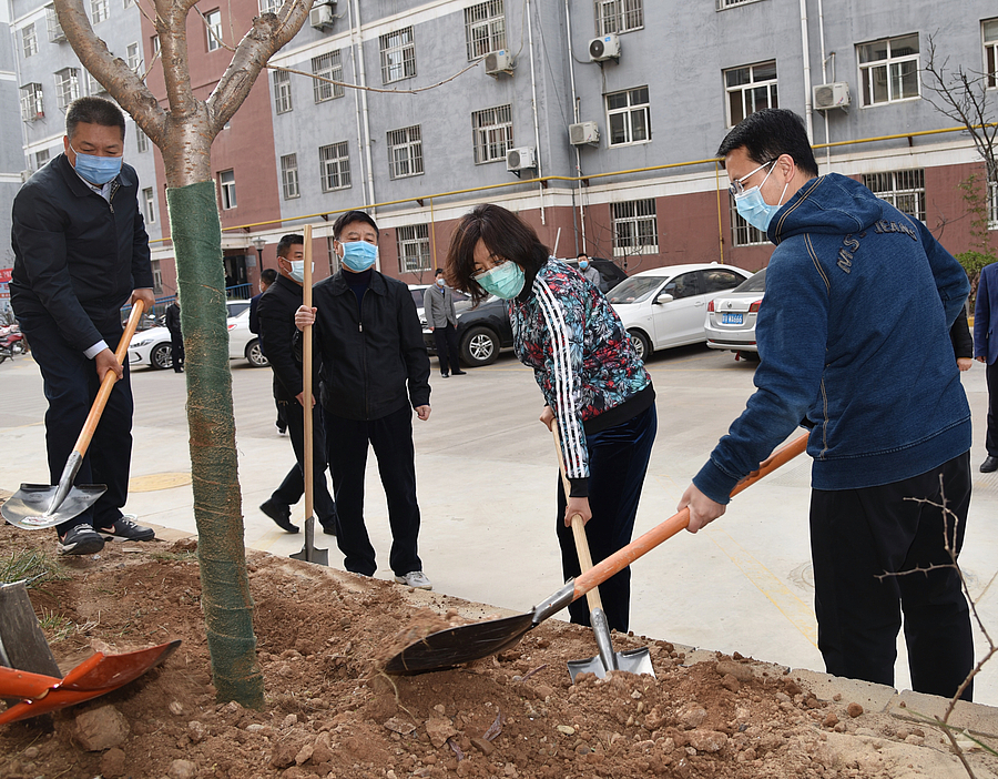 东苑小区是李台街道办原徐东湾村拆迁安置小区,于2012年建成,居住着362户居民,1700多常住人口。在东苑小区,李婧同干部群众一起挥锹植树,扶苗、培土、围堰、浇水,合力种下一株株樱花树、松树等。植树过程中,李婧与干部群众边植树边交流,详细了解今年植树增绿工作有关情况。李婧强调,全区上下要深入贯彻习近平生态文明思想,牢固树立和践行“绿水青山就是金山银山”的理念,抓住当前造林绿化的黄金时节,动员全民更加自觉地投入到植树增绿工作中去,让农科城更绿、更美。要持续开展全民爱国卫生运动,加大城乡环境卫生综合整治力度,不断提升全民的环境卫生意识和文明素养,形成人人参与环境整治、共同建设美丽家园的浓厚氛围。尤其要加大对农村、老旧小区和安置小区的环境改造提升,让群众有更多的幸福感、获得感。
