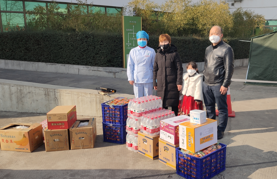 1月30日下午,杨凌示范区医院门诊楼前,一位女士在医院工作人员的协助下,正从自家车上将水银温度计、砂糖橘、香蕉、矿泉水、方便面等医疗及生活物资一一搬下车。