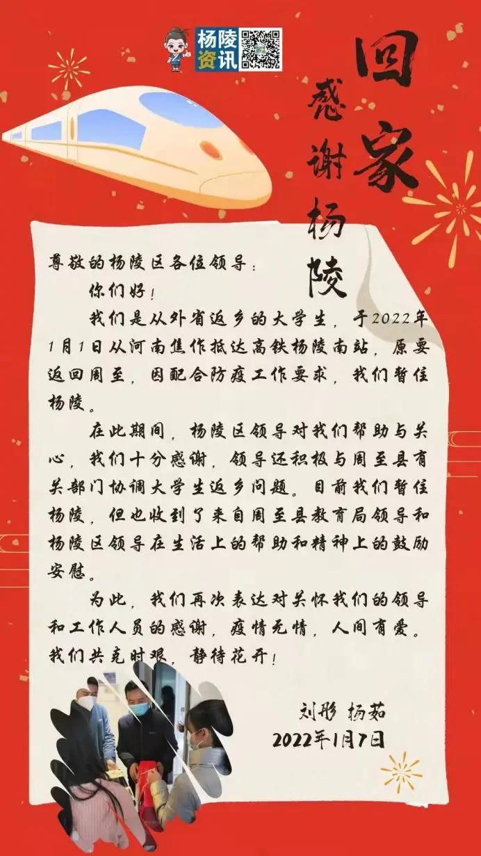 记者了解到,海报感谢信中落款的主人公是家住周至县的两名在外返乡大学生,分别叫刘彤、杨茹,2022年1月1日从河南省焦作市乘坐高铁抵达杨陵南站,下了高铁站准备回周至县,当她们来到新桥路渭河大桥(周至界)防控点时才了解到,由于疫情防控原因,她们无法如期回到周至家中,在杨凌也没有亲友可以投靠。一时间,两位同学吃住生活成了问题。