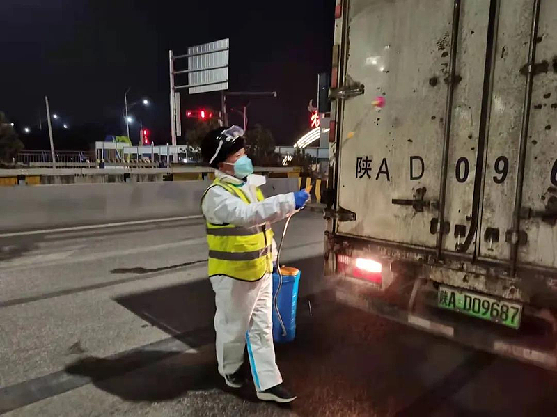 “除检查登记外,对于运输车辆更要严格消杀。”只见工作人员手提消毒喷洒机,正在对车辆进行仔细严谨的消杀,寒风吹过,消杀的水雾会回吹到手上,在冷风中,即使戴着手套,依旧冰冷刺骨,手僵了、脸紫了、耳朵没了知觉,但他们仍以昂扬的斗志和饱满的工作状态,坚守岗位。