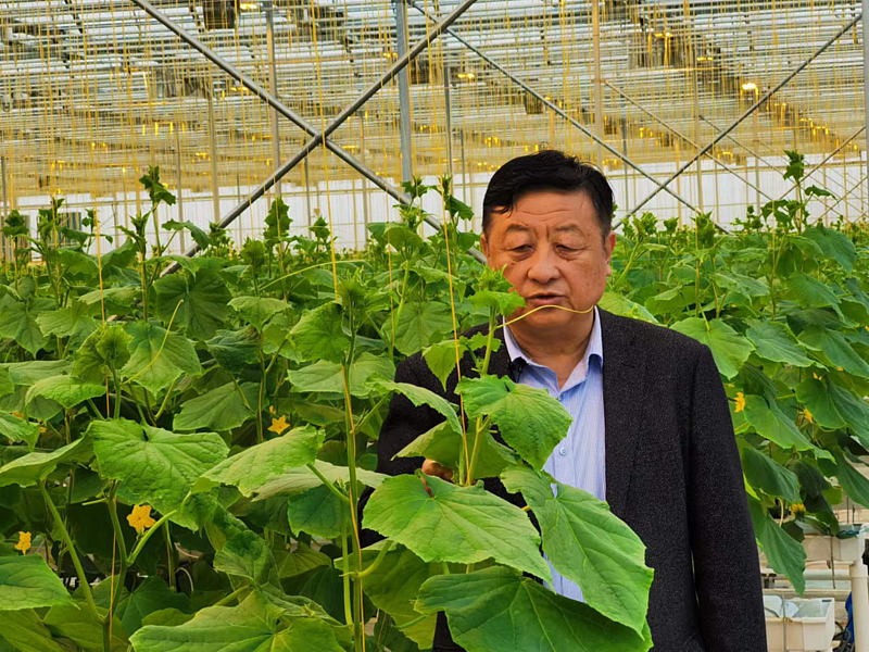 图为:在杨凌智慧农业示范园中东连栋温室大棚,邹志荣教授查看黄瓜长势。