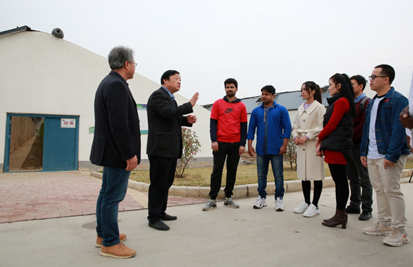 邹志荣教授(左二)与海外农业科技示范园专家张正茂(左一)向留学生们介绍新型日光温室的特点和应用情况。