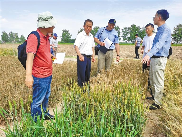 冯佰利团队在位于白俄罗斯的农业科技示范园查看示范种植的小麦(资料照片)。 受访者供图