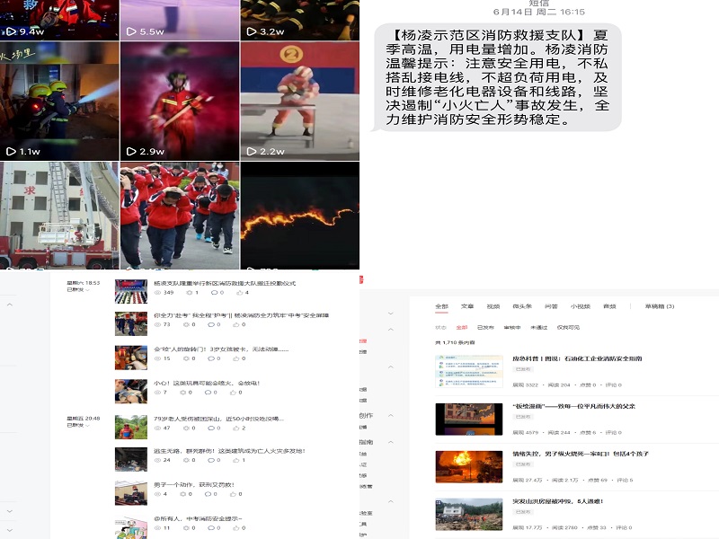 全媒融合聚合力。支队借助陕西电视台、陕西广播电视台等主流媒体播放夏季火灾防控专题和防火消防安全提示,并用微信、抖音、今日头条等新媒体平台更新发布消防安全提示、常识以及工作动态等内容,同时把宣传常识编写成言简意赅、通俗易懂的短信,使群众通过手机与消防安全常识零距离接触,提醒群众时刻关注消防安全,全面掀起消防宣传的热潮。