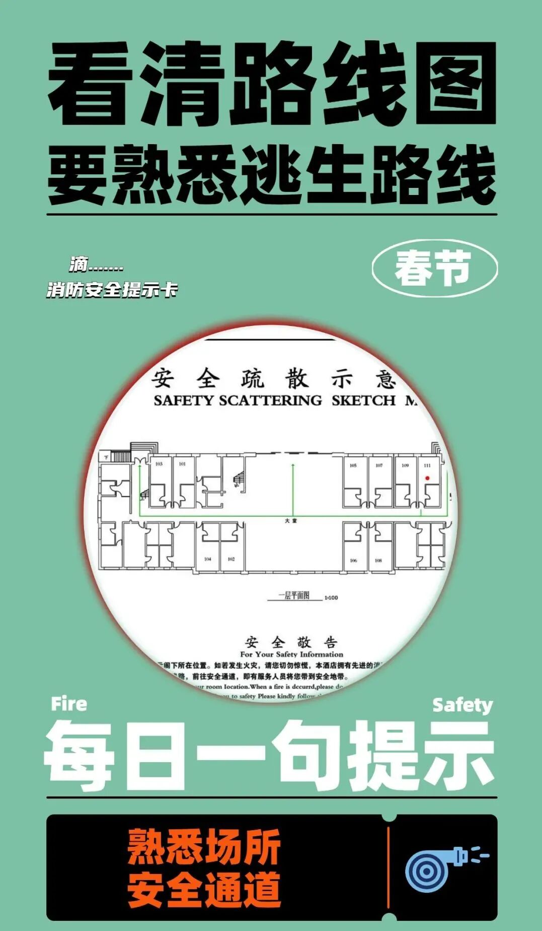 外出购物、住宿、娱乐,要注意熟悉所在场所的疏散通道位置和逃生路线,留意灭火器、防烟面罩等器材存放的位置和使用方法。