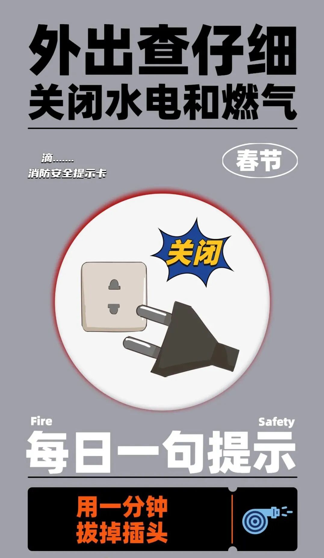 外出前,请确认已关闭所有水电及燃气,并检查是否有损坏、老化情况,如有请及时进行维修。