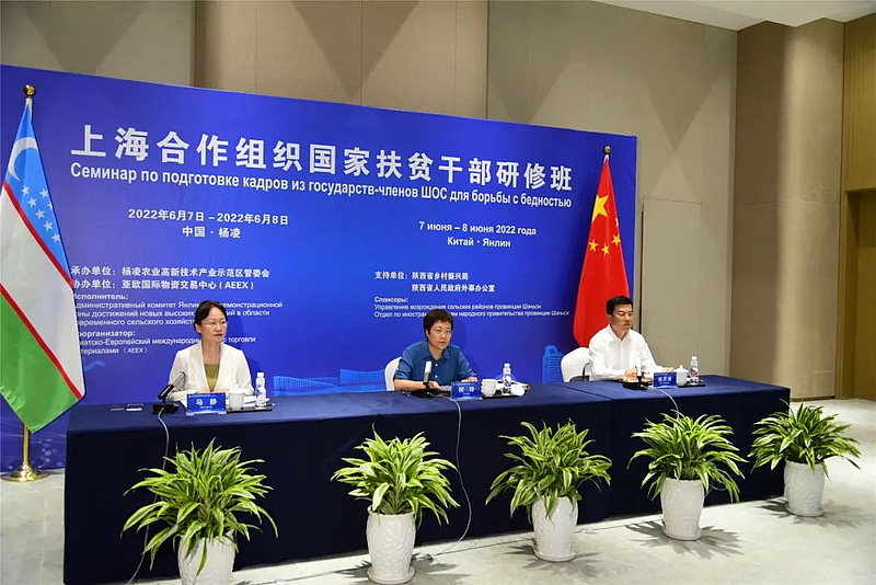 6月7日,上海合作组织国家扶贫干部研修班开班仪式在杨凌举行。陕西省人民政府外事办主任姚红娟、乌兹别克斯坦经济发展与减贫部减贫政策司副司长哈伊特穆拉托夫·萨比尔、乌兹别克斯坦驻华使馆商务参赞努里金·玛玛扎诺夫、乌兹别克斯坦旅游和文化遗产部副署长图尔苏纳利·库兹耶夫、杨凌示范区党工委副书记何玲、陕西省乡村振兴局副厅级督查专员魏德宏出席开班式并分别致辞。