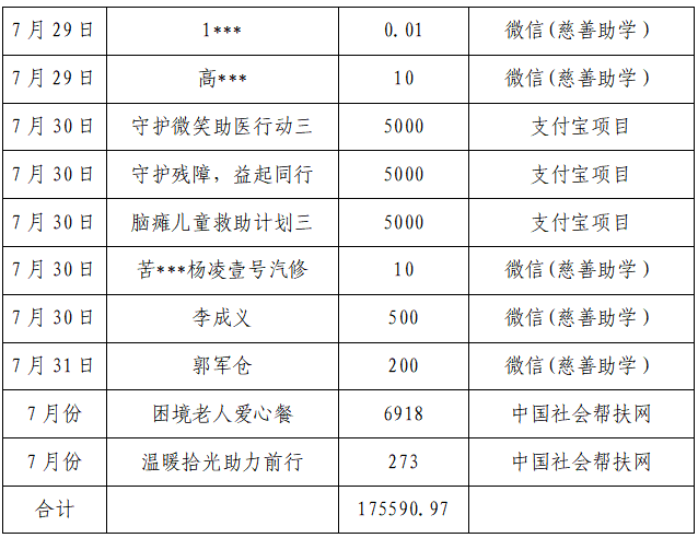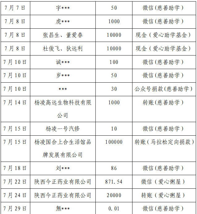 今年的慈善助学募捐活动,还发生和涌现出了好多感人故事及场面,特别是倡议发出后第一个响应的小**,通过微信扫码捐款6.60元,不留姓名,备注的暖心文字是“善意无关金额,爱心自成星河”;爱心人士杨凌蔓阳宝幼儿园的王静茹女士,通过手机银行转账3000元,备注了“一对一帮扶贫困大学生”的暖心文字;爱心人士昀**通过微信扫码捐款5000元,不愿留下姓名,只备注“资助贫困生”的暖心文字;爱心人士张昌生、杜俊飞分别捐款10000元,今年继续资助大学新生,张昌生表示今年要比去年多资助几个大学生;还有政务大厦的一位爱心人士向我会表示到时愿意选一位家庭困难的大学新生进行一对一帮扶资助;特别值得一提的是杨凌欧若拉视光中心的罗海宏女士,多次前来我会洽谈愿意为今年家庭困难的大学新生有需要的进行免费验光并爱心捐赠一副适配眼镜,还在我会设立“慈善护眼专项基金”5万元,定向用于杨凌城乡困难家庭的青少年学生近视、远视、散光等方面的公益科普、免费资助、慈善救助以及对当年大学新生开展近视、弱视免费检查、验光、配镜及第二次配镜等活动;还有西安市杨凌商会、杨凌企业家协会等正在带头捐赠和按系统按行业积极开展动员活动等等......;目前,8月份我区慈善助学募捐活动仍在有序进行之中。下面就7月份社会捐赠情况,特别是慈善助学捐款明细按时间顺序公布如下: