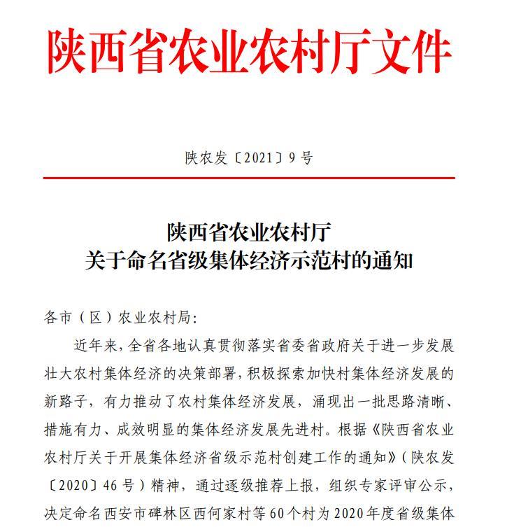 1月26日,陕西省农业农村厅官网发布《陕西省农业农村厅关于命名省级集体经济示范村的通知》。决定命名西安市碑林区西何家村等60个村为2020年度省级集体经济示范村,其中,杨凌五泉镇王上村、大寨街道办寨东村入选。