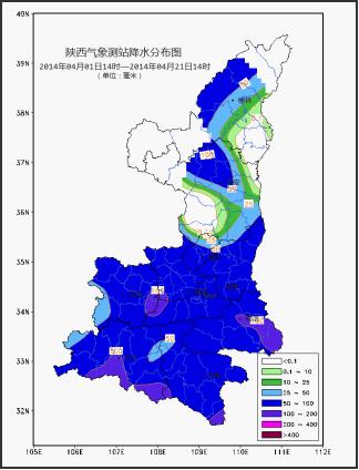 图2 陕西省2014年4月1-21日降水总量分布
