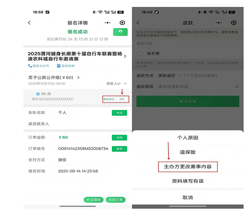 退费申请步骤:在野途小程序点开报名订单,选择退款→退款原因选择主办方更改赛事内容,费用将在1—7个工作日内退回。