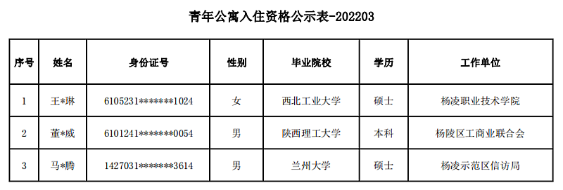 根据《杨凌青年公寓管理办法》和申请人递交资料先后顺序,经杨陵区、示范区两级保障房管理部门审核,现将杨凌青年公寓申请人员入住资格进行公示。公示期限为4天(2022年04月14日-04月17日)。