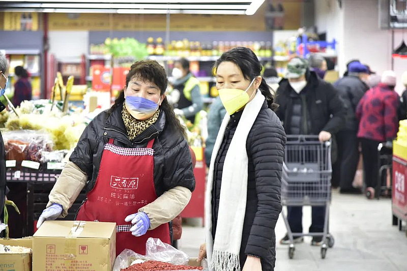 记者在超市里看到,工作人员在忙碌地整理货品,引导顾客;顾客们忙着选购自己心仪的商品,尤其是在生鲜区,围满了买菜买肉的顾客。