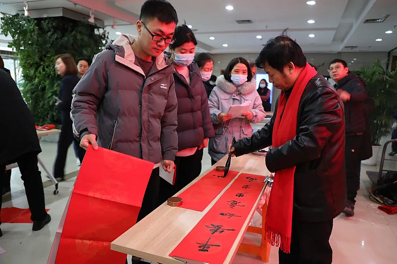 活动现场,长桌排开,红幅铺展,墨香飘溢,气氛热烈。只见书法家们笔锋婉转,妙句成双:“龙腾虎跃千家喜,雨顺风调万户春”“迎春迎福迎富贵,接财接福接平安”“天增岁月人增寿,春满乾坤福满楼”……不一会儿功夫,一幅幅寓意吉祥的春联和一个个饱含神韵的“福”字就依次送入人们手中,也让大家在热闹祥和的氛围中提前感受到浓浓的“年味”。