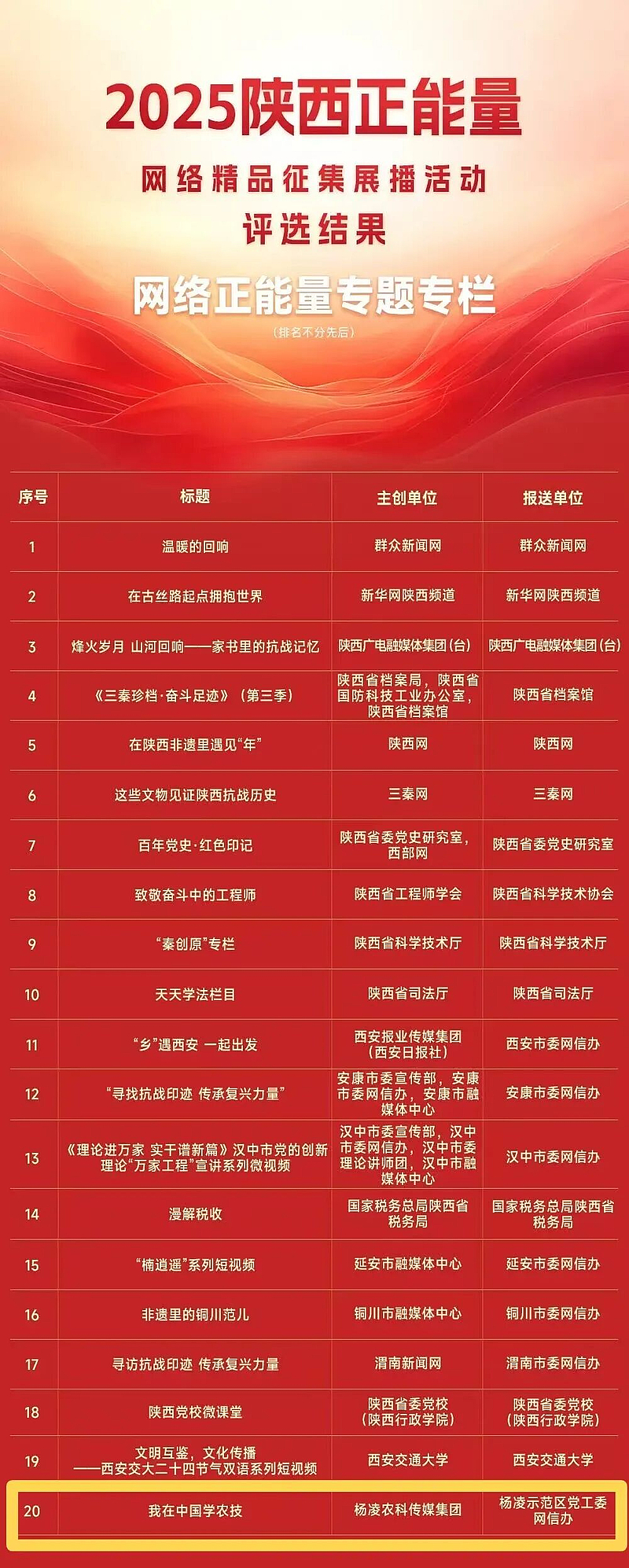 日前,陕西省委网信办发布2025陕西正能量网络精品征集展播活动评选结果,经作品征集、评审、公示等环节,评选出了100件网民认可、社会认同、影响广泛的网络精品。其中,杨凌示范区共有3件作品入选分别是西北农林科技大学主创的我欠先生一个拥抱、杨凌农科传媒集团主创的我在中国学农技、2025“我在杨凌看上合”。网络主题宣传活动完整名单如下: