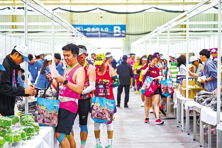 杨凌农科城马拉松赛后,参赛者领取装有农特产品的“完赛包”(4月13日摄)。 本报记者 付玉玮摄