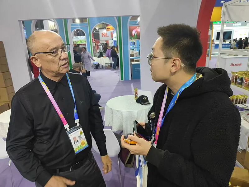 2025年10月24日,塔吉克斯坦杏和公司负责人普洛特·阿舒罗夫(左)介绍自己参加第32届中国杨凌农业高新科技成果博览会的相关情况。