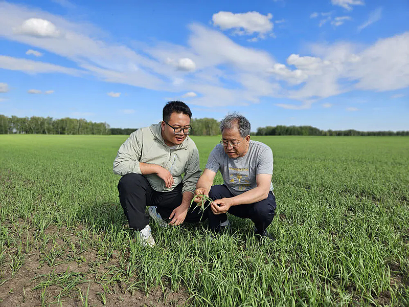 2024年6月19日,西北农林科技大学研究员张正茂(右)与学生在哈萨克斯坦北哈州的农业示范园查看小麦生长情况。