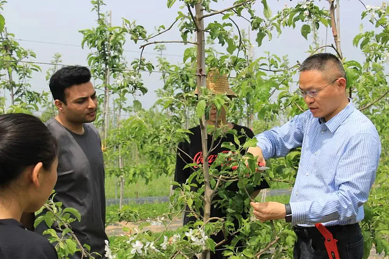 2024年4月,西北农林科技大学教授张东(右一)在吉尔吉斯斯坦与当地果农交流苹果种植技术。