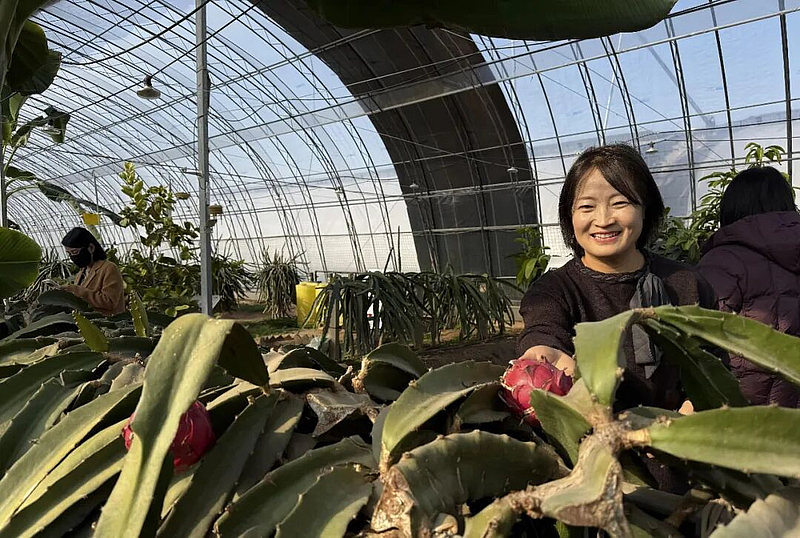 从2018年试种起步,到规模化建棚,王艳与西北农林科技大学的专家紧密合作,历经多年摸索,成功研发出适合北方气候的种植模式,形成了一套完整的设施火龙果栽培技术方案。如今,她的基地已培育出28个火龙果品种,年产果超500吨,年收入达700万元,带动30余名农民就近就业。