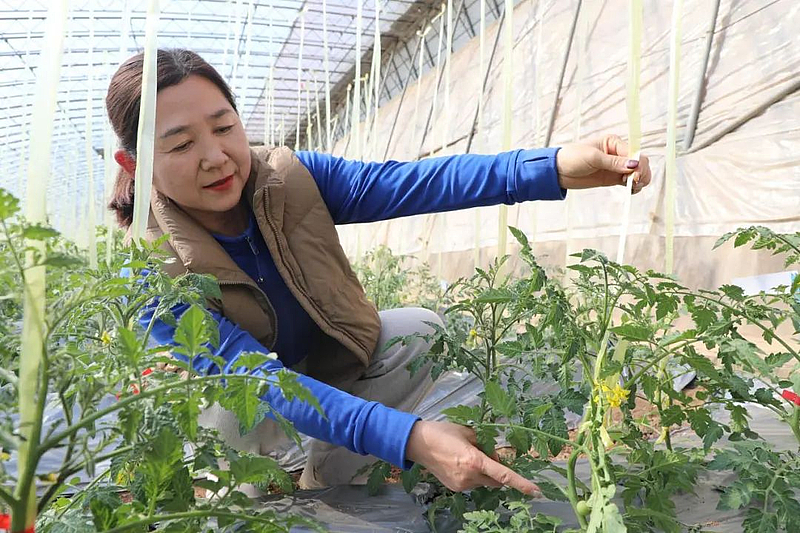 魏春侠一边为番茄蔓进行整枝,一边为记者讲述大棚内春耕生产工作的相关情况。