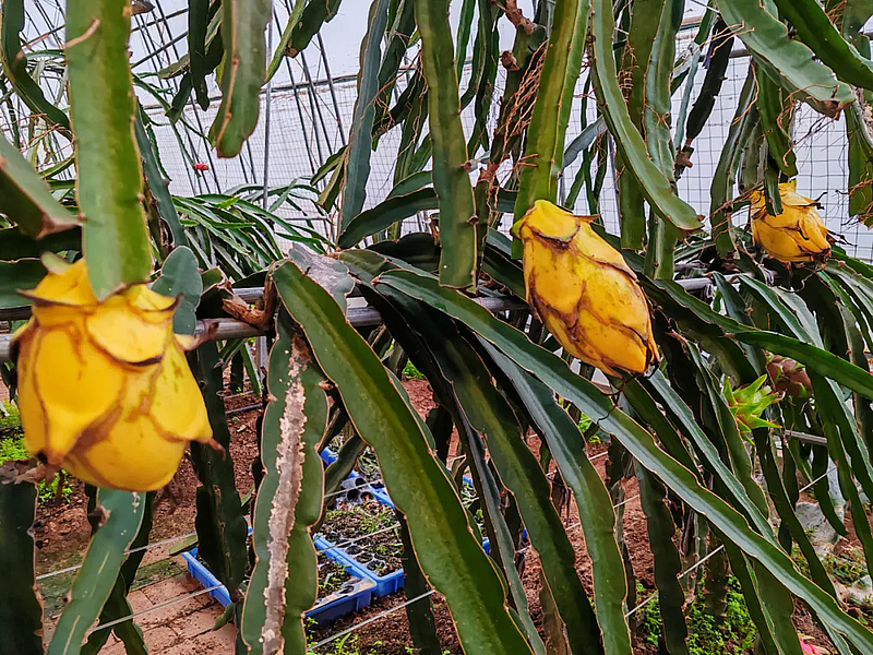 悬挂在藤蔓间的传感器实时捕捉温度、湿度数据,屏幕上26℃的数字稳定跳动,这是火龙果生长的“黄金温度”;入夜后自动亮起的LED补光灯,正为北方短日照“补课”;根部缠绕的滴灌管线,精准把水肥送到每一株作物“嘴边”,从“大水漫灌”到“精准滴灌”,科技让“南果”在杨凌扎下了根。