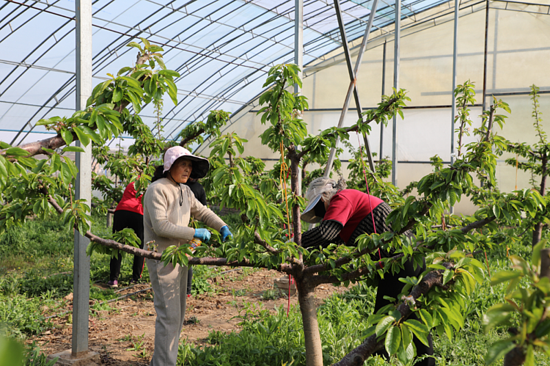 “我们现在建成了两座连栋大棚,今年第一批樱桃预计能产4000到5000斤,眼下正是授粉关键期,每天都要雇10位左右村民来帮忙。”农场负责人许卫平介绍。得益于先进的设施栽培技术,这里的樱桃上市时间比露天种植足足提前了15-20天,抢先占据市场先机,也让樱桃的经济效益大幅提升。