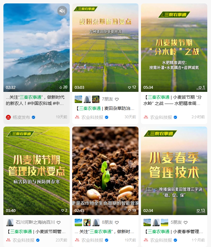 同时,通过构建“陕西农技视频号+三秦农事通”双轮驱动传播矩阵,视频号侧重权威发布、系统推送,三秦农事通平台侧重精品打造、IP塑造,在全省107个县区融媒体同步上线,两平台内容互通、优势互补,形成叠加传播效应。依托省市县三级农技体系,组织基层单位、农技人员、经营主体广泛转发,推动内容直达田间地头;同步借助农业科技报等媒体矩阵扩大宣传,形成培训育人才、平台出内容、矩阵广传播的良性循环。