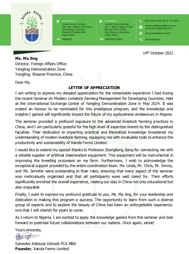 尼日利亚Xanda农场有限公司创始人Sylvester Adetunji Oshode表示:“在杨凌研修所获得的知识和见解将极大地影响我在尼日利亚农业企业的未来。此次中国之行不仅仅是一次教育之旅,也是人生中一次愉快的经历,回到尼日利亚后,我迫不及待地想要将研讨会上学到的知识应用于实践,并期待我们两国之间未来可能的合作。”