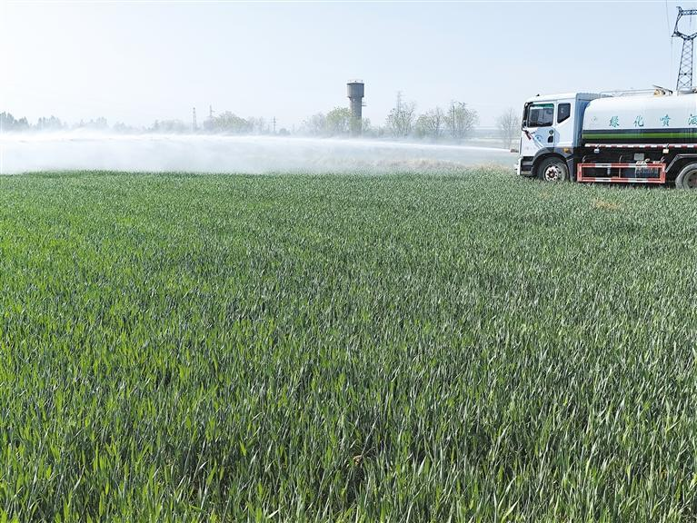 连日来,永寿县采取滴灌、喷灌、浇灌等形式,开展小麦、果树田间抗旱。图为4月20日,永寿县监军街道封侯村种植户在给小麦进行喷灌。本报通讯员 李建龙摄