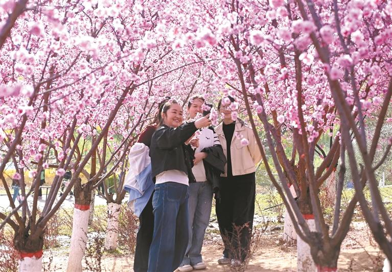 清明假期,延安以花为媒,将赏花转化为可感可及的多元消费体验,让“春日经济”绽放别样活力。图为4月5日,市民游客在延安新区鲁艺生态公园踏青游玩,打卡拍照。 本报通讯员 王德荣摄