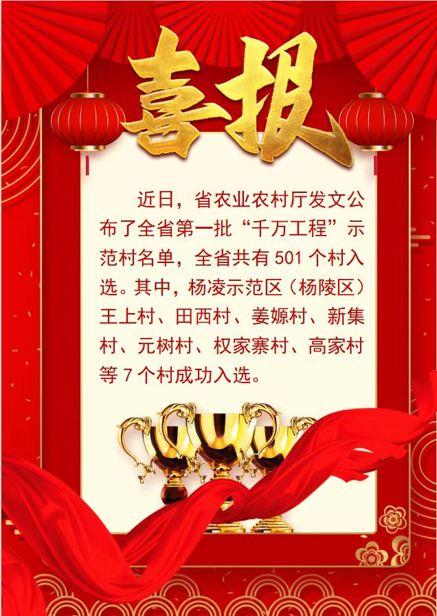 日前,省农业农村厅公布了全省第一批“千万工程”示范村名单,全省共有501个村入选。其中,杨凌示范区(杨陵区)王上村、田西村、姜嫄村、新集村、元树村、权家寨村、高家村等7个村成功入选。