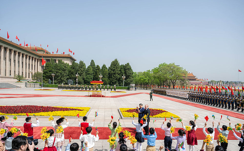 4月23日上午,国家主席习近平在北京人民大会堂同来华进行国事访问的阿塞拜疆总统阿利耶夫举行会谈。这是会谈前,习近平在人民大会堂东门外广场为阿利耶夫举行欢迎仪式。新华社记者 李涛 摄