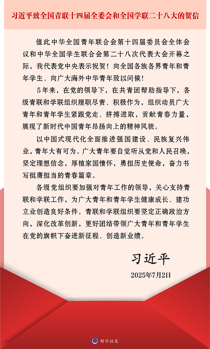 新华社北京7月2日电 中华全国青年联合会第十四届委员会全体会议、中华全国学生联合会第二十八次代表大会2日上午在京开幕。中共中央总书记、国家主席、中央军委主席习近平发来贺信,代表党中央表示祝贺,向全国各族各界青年和青年学生、向广大海外中华青年致以问候。