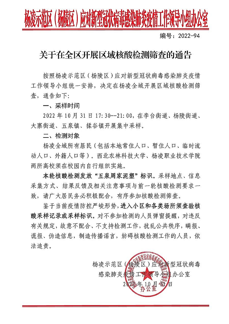 按照杨凌示范区(杨陵区)应对新型冠状病毒感染肺炎疫情工作领导小组统一安排,决定于10月31日17:30-21:00在杨凌全域开展区域核酸检测筛查,通告如下: