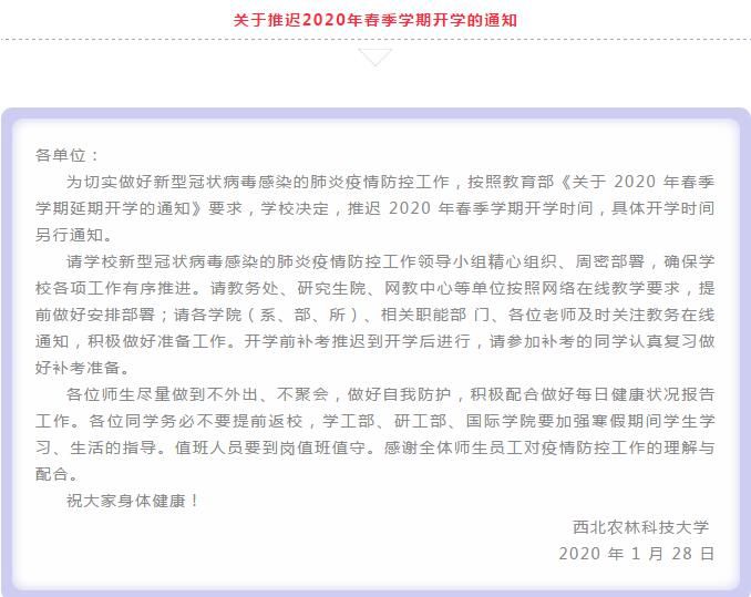 为切实做好新型冠状病毒感染的肺炎疫情防控工作,按照教育部《关于 2020 年春季学期延期开学的通知》要求,1 月 28 日,西北农林科技大学决定,推迟 2020 年春季学期开学时间,具体开学时间另行通知。