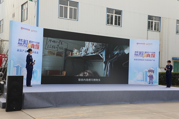 模拟实验环节,采取“蓝朋友”带您现场辨别真假(如水枪 、水带、灭火毯、灭火器、防火门、防烟面罩 、应急照明灯、消防员服饰)和现场模拟防火门着火实验,以“科普讲解+实景实验”的形式宣传消防产品相关标准,让群众直观熟练地掌握辨别真假消防器材的能力。