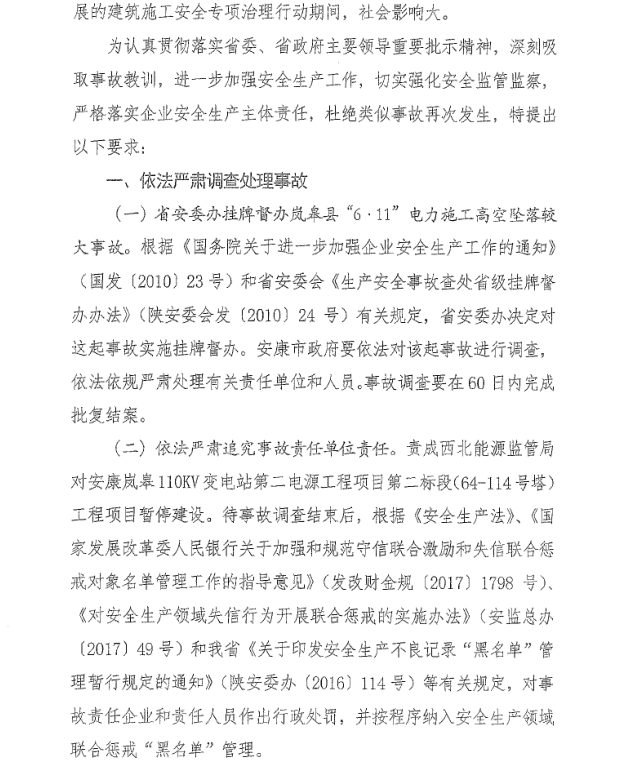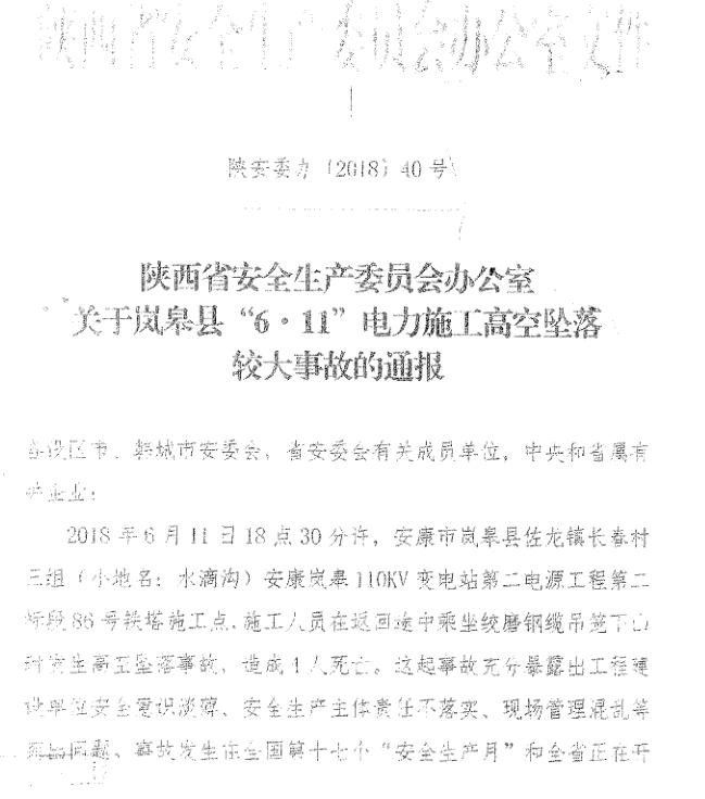 现将陕西省安全生产安委会办公室《关于转发岚皋县“6·11”电力施工高空坠落较大事故的通报》(陕安委办〔2018〕40号)转发你们,请深刻吸取事故教训,进一步加强安全生产工作,切实强化安全生产监管监察,严格落实企业安全生产主体责任,杜绝类似事故再次发生。